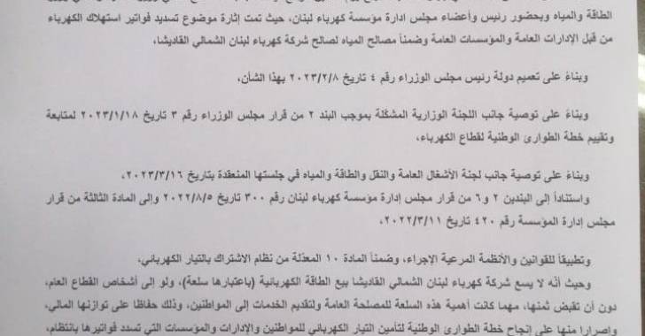 وبناء على الاجتماع المنعقد في وزارة المالية صباح يوم الاثنين الواقع فيه ۲۰۲۲/۹/۲٥ مع معالي وزير المالية ومعالي وزير الطاقة والمياه وبحضور رئيس وأعضاء مجلس إدارة مؤسسة كهرباء لبنان حيث تمت إثارة موضوع تسديد فواتير استهلاك الكهرباء من قبل الإدارات العامة والمؤسسات العامة وضمناً مصالح المياه لصالح شركة كهرباء لبنان الشمالي القاديشاء