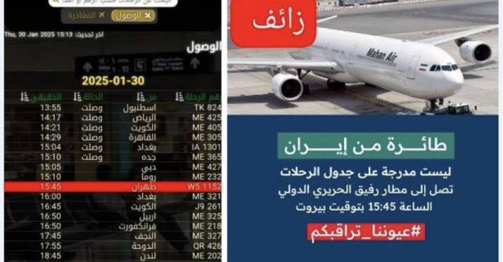 فريق “فاكت شيك ليبانون” في وزارة الاعلام وبعد الاتصال بالمدير العام للطيران المدني في مطار رفيق الحريري الدولي فادي الحسن تبين ان الطائرة الايرانية القادمة من طهران مدرجة على جدول الرحلات ورقمها W5 1152، وبالتالي فان الخبر المتعلق بوصولها من دون علم المطار ،” زائف”.