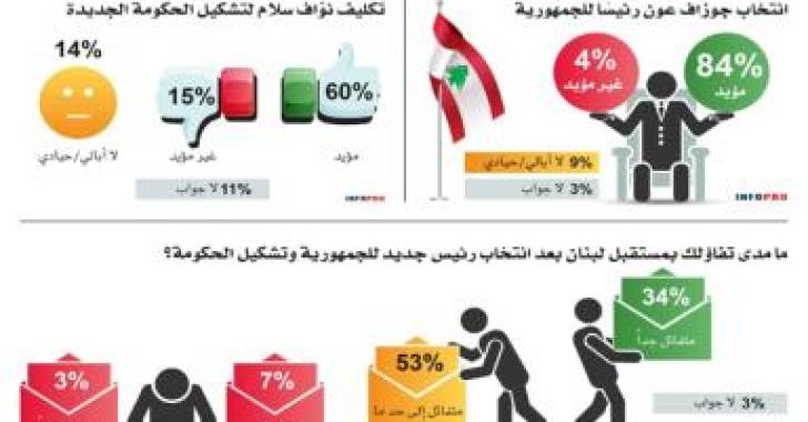 أظهر استبيان أجرته مؤسسة InfoPro ارتياحًا كبيرًا لدى المواطنين لانتخاب العماد جوزاف عون رئيساً للجمهورية وتكليف القاضي نواف سلام بتشكيل الحكومة، وكذلك للتشكيلة الوزارية المُعلنة.