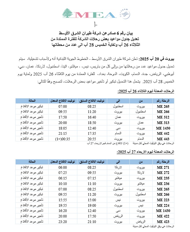أعلنت شركة طيران الشرق الأوسط – الخطوط الجوية اللبنانية، في بيان اليوم، عن إجراء تعديلات على جدول بعض رحلاتها من وإلى عدة محطات خارجية، وذلك خلال الفترة الممتدة بين الثلاثاء 26 آب والخميس 28 آب 2025، لأسباب تشغيلية.