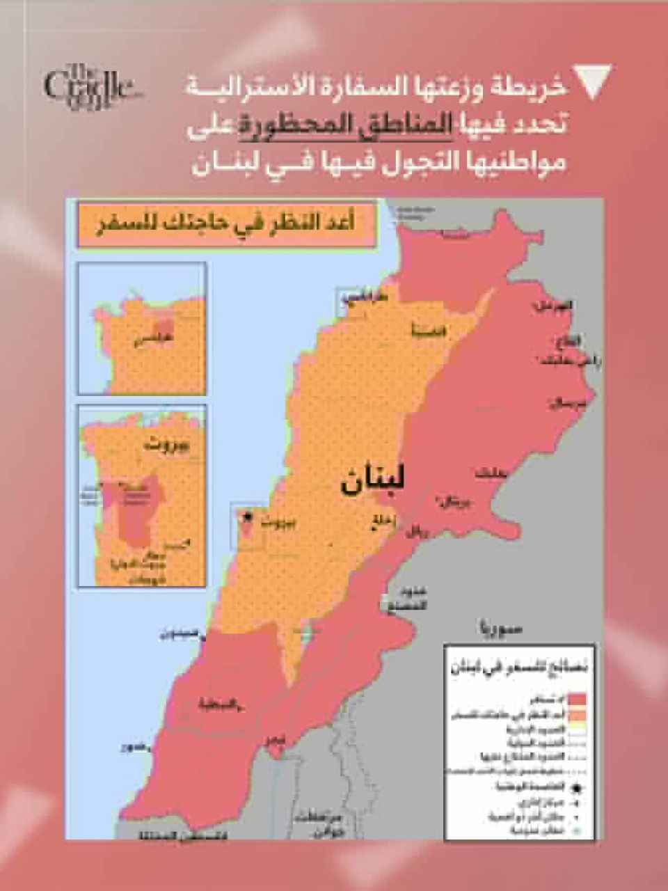 نشرت السفارة الأسترالية في بيروت تحذيراً عبر حسابها الرسمي دعت فيه رعاياها المتواجدين في لبنان إلى تجنّب التوجّه إلى عدد من المناطق.
