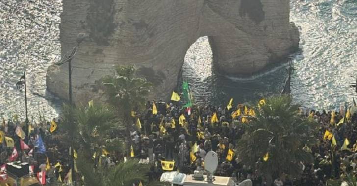 بدء إنارة صخرة الروشة بصورة الشهيدين نصرالله وصفي الدين (فيديو)