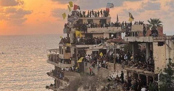 توجه عدد من المشاركين الى أحد المقاهي المطلة على صخرة الروشة خلال اقامة فعالية إحياء ذكرى اغتيال الأمينين العامين السابقين لحزب الله حسن نصرالله وهاشم صفي الدين.