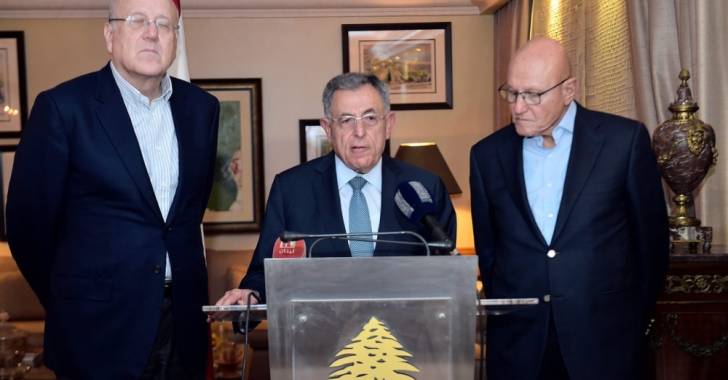 في ضوء التطورات الحاصلة على مختلف المستويات تداعى رؤساء الحكومة السابقون: نجيب ميقاتي، فؤاد السنيورة، وتمام سلام للبحث والتداول بشأنها، وحيث توقفوا أمام النقاط الآتية:
