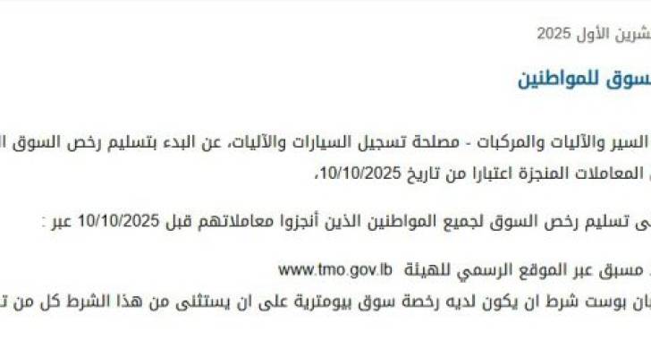 أعلنت وزارة الداخلية والبلديات -هيئة ادارة السير والآليات والمركبات – مصلحة تسجيل السيارات والآليات، على حسابها على منصة “إكس”، البدء بتسليم رخص السوق البيومترية في كل أقسام وفروع المصلحة لكل من المعاملات المنجزة اعتبارا من تاريخ 10/10/2025.
