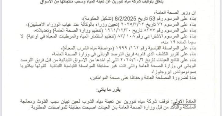 أصدرت وزارة الصحة العامة اللبنانية قراراً، يقضي بتوقيف شركة “مياه تنورين” مؤقتاً عن تعبئة مياه الشرب وسحب منتجاتها من الأسواق اللبنانية.