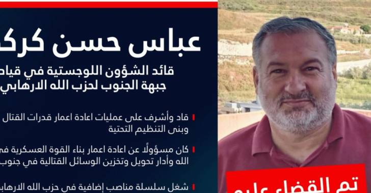 أعلن الجيش الإسرائيلي اليوم الجمعة عن أنّه استهدف في منطقة النبطية في جنوب لبنان "عباس حسن كركي، وهو مسؤول الشؤون اللوجستية في قيادة جبهة الجنوب في "حزب الله".