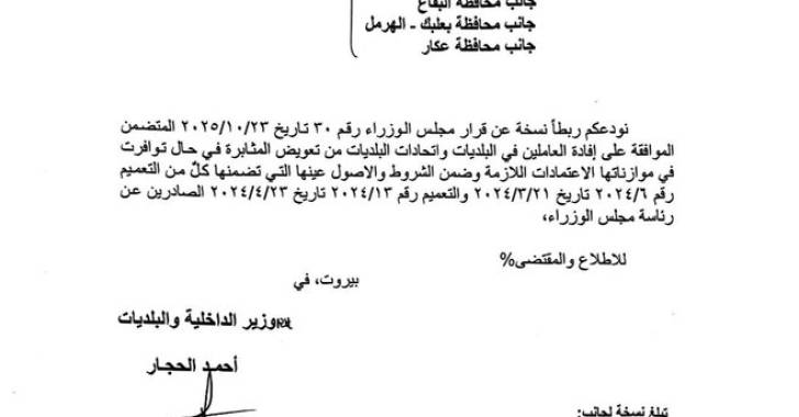 تعمم وزارة الداخلية والبلديات قرار مجلس الوزراء رقم 30 تاريخ 23/10/2025، القاضي بالموافقة على إفادة العاملين في البلديات واتحادات البلديات من تعويض المثابرة في حال توافر الاعتمادات اللازمة في موازناتها.
