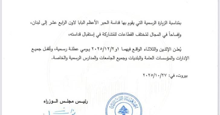 مذكرة إقفال لمناسبة زيارة قداسة البابا الى لبنان