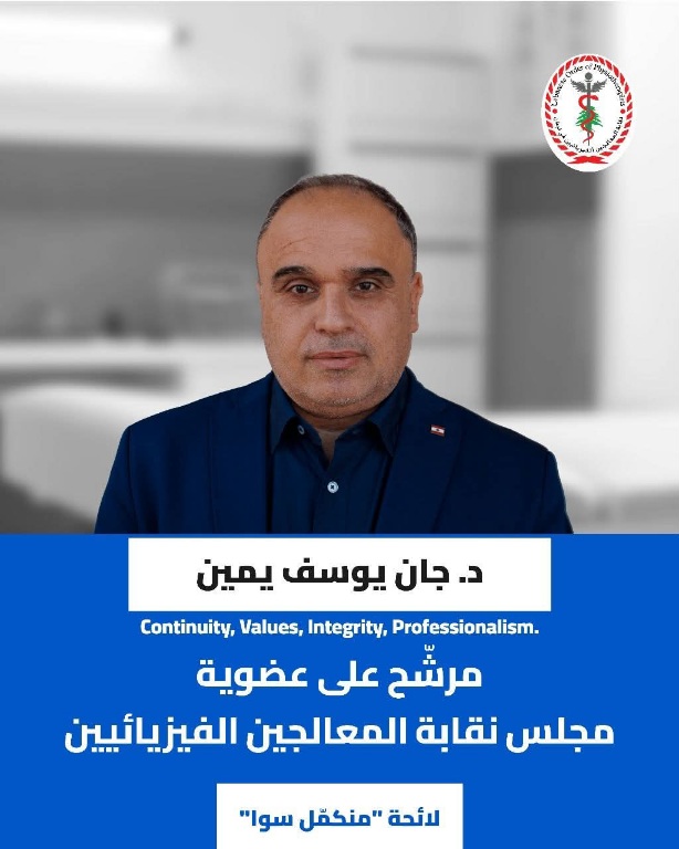 انطلاقًا من إيماني العميق بمهنة العلاج الفيزيائي ورسالتها الإنسانية، أعلن ترشّحي لعضوية مجلس نقابة المعالجين الفيزيائيين في لبنان، واضعًا خبرتي وشغفي بخدمة المهنة والزملاء في خدمة النقابة.