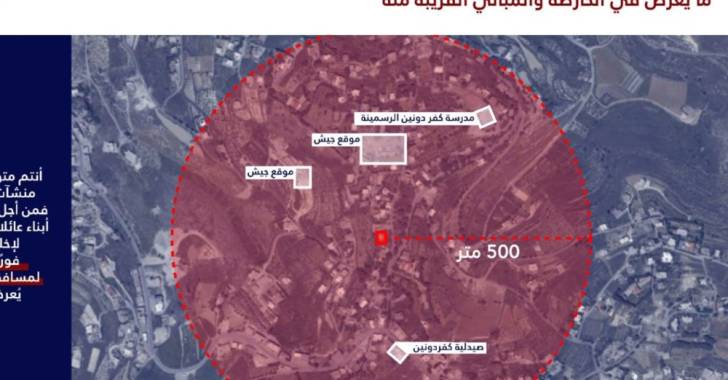 أضاف: "نتوجه إلى سكان المبنى المحدد بالأحمر في الخريطة المرفقة والمباني المجاورة له: أنتم تتواجدون بالقرب من مبنى يستخدمه حزب الله الإرهابي فمن أجل سلامتكم أنتم مضطرون لإخلاء المباني فورًا والابتعاد عنها لمسافة لا تقل عن 500 متر البقاء في منطقة المبنى المحدد يعرضكم للخطر."