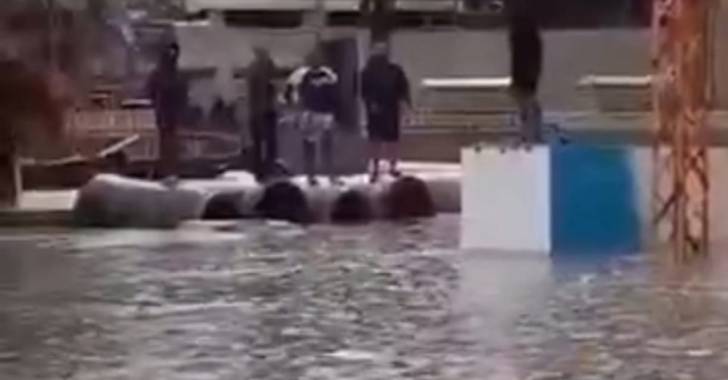 انتشر فيديو عبر وسائل التواصل الاجتماعي لشباب على طريق الجناح يحولون المأساة التي يعانونها جراء هطول الامطار الكثيفة وغرق الطرقات الى "نكة".