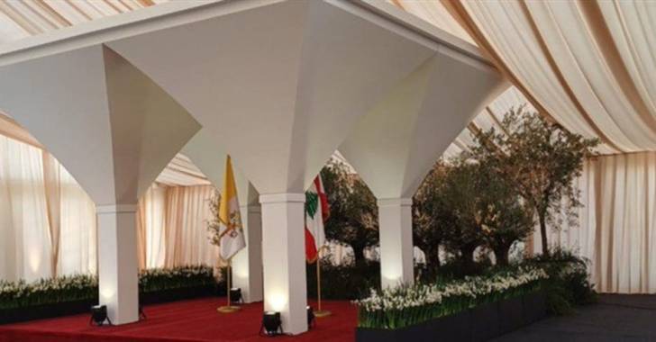 وتمّ تزيين المبنى والمنصة حيث سيقف البابا ورئيس الجمهورية العماد جوزف عون بزهرة النارسيس الفريدة التي ترمز إلى الرجاء والتجدّد، إضافة الى أشجار الزيتون، وفرشت الأرض بالسجاد الأحمر.