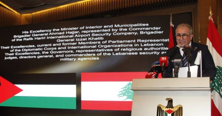 وقال: نؤكد بأن وجود سلاح المخيمات خارج اطار الدولة هو اضعاف للبنان وتسليم السلاح للجيش هي خطوة على طريق تأكيد حفظ الأمن والاستقرار في لبنان، كما نشدد على احترام القوانين اللبنانية والالتزام بها وتعزيز التنسيق الأمني بين الجمهورية اللبنانية ودولة فلسطين لضمان الأمن والاستقرار داخل المخيمات ومحيطها، ودعم لبنان في تنفيذ التزاماته الدولية والحفاظ على امنه واستقراره وسيادته على أرضه، ورفض التوطين، وحماية حق العودة لأبناء شَعبِنا، استناداً إلى القرار الدولي 194، وبانتظار ذلك، بما يُعزز الأمن داخل المُخيمات وفي جوارها، ويحفظ العيش الكريم لأبناء شَعبِنا، من خلال تحسين بعض الخدمات، وتمكين أهلنا الصامدين من إعادة ترميم منازلهم المُهدمة أو الآيلة إلى السقوط، وإدخال الأثاث، والأدوات المنزلية، وهي خطوات بدأنا نلمس نتائجها بشكل واضح على طريق معالجة الحقوق الاجتماعية والمعيشية، وحق العمل والتملُّك.”