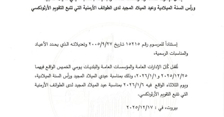 logo بالفيديو… الجيش عثر على نفقٍ في بلدة تولين logo قرب مستشفى سيدة مارتين في جبيل… الأمن العام أوقف شخصاً وهذا ما اعترف به logo مذكرة اقفال بمناسبة الأعياد logo المجلس الوطني للإعلام يُخطر القضاء: منصة «لبناننا» غير مرخّصة وشكاوى بتهديدات وحجب رواتب logo اجتماع مجلس الأمن الداخلي المركزي برآسة وزير الداخلية والبلديات أحمد الحجار logo توقيف مروّج عملة مزيّفة وآخر بجرم قطع أشجار معمّرة logo أبو فاعور: أي تلاعب بالانتخابات مرفوض logo إقرار قانون تنظيم الموازنة والأقساط في المدارس الخاصة معدلًا