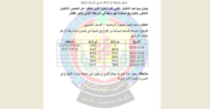 صدر عن المديرية العامة لأمن الدولة – قسم الإعلام والتوجيه والعلاقات العامة، البيان الآتي: “إلحاقًا لبيانها السابق المتعلّق بمواعيد الاختبار الطبي للمرشّحين المتطوّعين لرتبة مأمور متمرّن (ذكور فقط)، تعلن المديرية العامة لأمن الدولة عن جدول جديد بمواعيد الإختبار الطبي للمرشحين الذين تخلفوا عن حضور الاختبار المذكور بالتواريخ المحددة لهم سابقاً (ذكور فقط)، في مدينة كميل شمعون الرياضية – المدخل الجنوبي، عند الساعة السابعة صباحًا، وذلك وفقًا لأرقام الترشيح والتواريخ المذكورة ادناه.