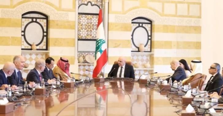 اجتمع ممثلو اللجنة الخماسية في قصر بعبدا مع رئيس الجمهورية العماد جوزاف عون، بحضور المبعوث الرئاسي الفرنسي جان إيف لودريان، والموفد السعودي الأمير يزيد بن فرحان، والسفير السعودي في لبنان وليد بخاري، والسفير الأميركي ميشال عيسى، والسفير المصري علاء موسى، والسفير القطري الشيخ سعود آل ثاني، ومساعد وزير الخارجية القطري محمد بن عبدالعزيز آل ثاني.