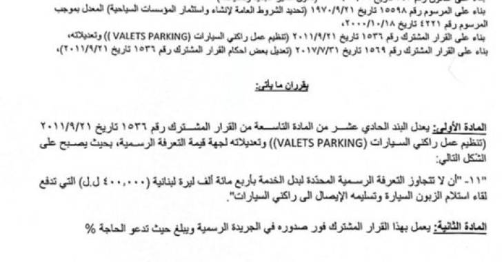 عممت وزارتا الداخلية والبلديات والسياحة القرار المشترك حول تعديل قيمة التعرفة الرسمية المحددة لبدل الخدمة لراكني السيارات Valets parking.