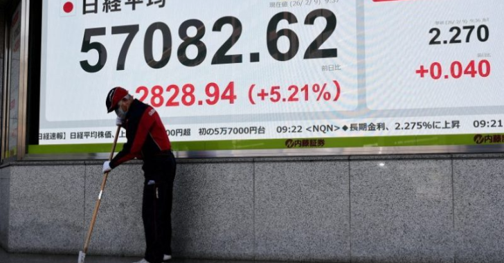 ومع استئناف التداول بعد عطلة في اليابان، سجل المؤشر نيكي 225 القياسي مستوى قياسيا خلال اليوم بلغ 58015.08 نقطة قبل أن يتخلى عن بعض المكاسب ليغلق عند 57639.84 نقطة.