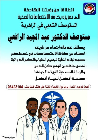 تعلن المؤسسة الوطنية الاجتماعية مواصلة تقديم خدماتها الصحية والطبية في مستوصف الدكتور عبدالمجيد الرافعي الشعبي في منطقة الزاهرية بطرابلس طوال ايام الأسبوع ما عدا يوم الاحد والأعياد الرسمية من الساعة التاسعة صباحاً حتى الثالثة عصراً باشراف :