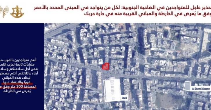 أصدر أفيخاي أدرعي، المتحدث السابق باسم الجيش الإسرائيلي، إنذاراً جديداً موجهاً إلى جميع السكان المتواجدين في منطقة الضاحية الجنوبية، وتحديداً في المبنى المحدد في الخريطة المرفقة والمباني المجاورة له في حي حارة حريك.