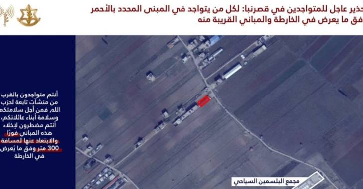 وقال الجيش الإسرائيلي: “نحث سكان المبنى المحدد بالأحمر في الخريطة المرفقة والمباني المجاورة له: أنتم تتواجدون بالقرب من مبنى يستخدمه حزب الله فمن أجل سلامتكم أنتم مضطرون لإخلائه فورًا والابتعاد عنه لمسافة لا تقل عن 300 متر.