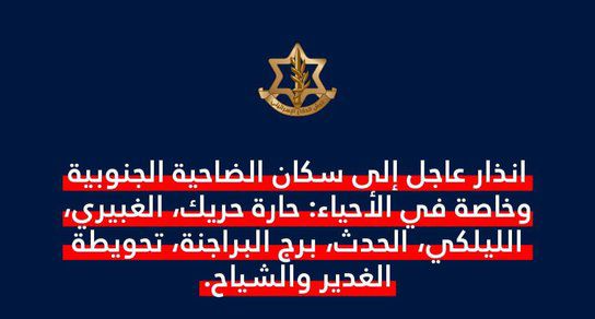 جدّد الجيش الإسرائيلي إنذاره للضاحية الجنوبية وخصوصًا أحياء حارة حريك، الغبيري، الليلكي، الحدث، برج البراجنة، تحويطة الغدير والشياح.