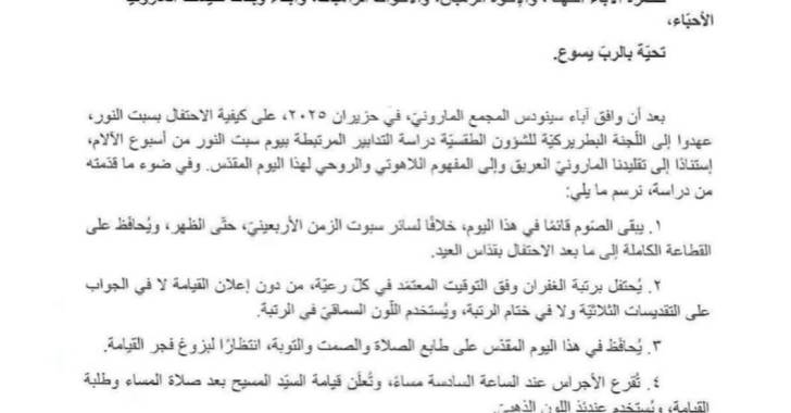 بعد أن وافق آباء سينودس المجمع المارونيّ، في حزيران ٢٠٢٥، على كيفية الاحتفال بسبت النور، عهدوا إلى اللجنة البطريركيّة للشؤون الطقسية دراسة التدابير المرتبطة بيوم سبت النور من أسبوع الألام، إستنادًا إلى تقليدنا المارونيّ العريق وإلى المفهوم اللاهوتي والروحي لهذا اليوم المقدّس. وفي ضوء ما قدّمته من دراسة، نرسم ما يلي: