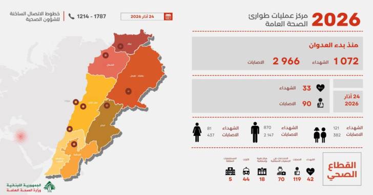 أعلنت وزارة الصحة بسقوط 1072 شهيداً و2966 جريحاً منذ بداية العدوان الإسرائيلي.