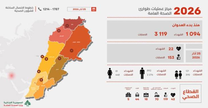 نشرت وزارة الصحة العامة التقرير اليومي الصادر عن مركز عمليات طوارئ الصحة حول تطورات ​العدوان الإسرائيلي على لبنان​.
