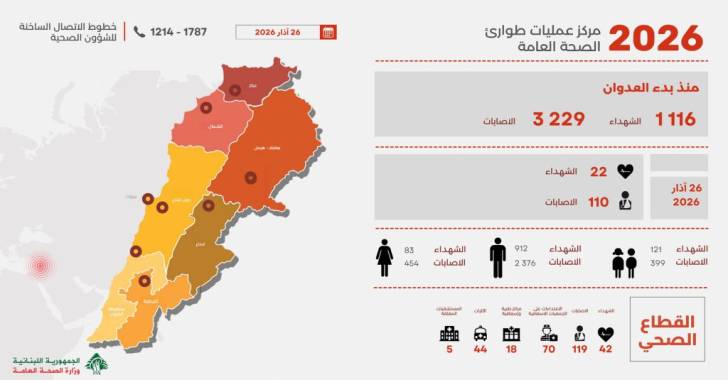 نشرت وزارة الصحة العامة التقرير اليومي الصادر عن مركز عمليات طوارئ الصحة حول تطورات العدوان الإسرائيلي على لبنان.