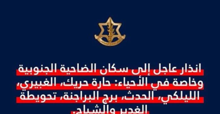 جدد المتحدث باسم الجيش الاسرائيلي افيخاي ادرعي تحذيره لسكان الضاحية الجنوبية لبيروت، وخاصة في الأحياء: