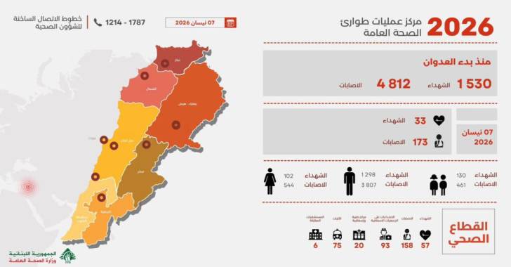 نشرت وزارة الصحة العامة التقرير اليومي الصادر عن مركز عمليات طوارئ الصحة حول تطورات العدوان الإسرائيلي على لبنان.واشار التقرير الى أن “العدد الإجمالي للشهداء منذ 2 آذار حتى 7 نيسان ارتفع إلى 1530، كما ارتفع عدد الجرحى الى 4812”.