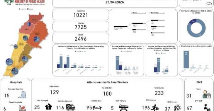 صدر عن مركز عمليات طوارئ الصحة التابع لوزارة الصحة العامة بيان أعلن أن الحصيلة التراكمية الاجمالية للعدوان منذ 2 آذار حتى 25 نيسان باتت كالتالي :