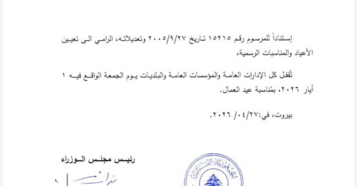 اصدر رئيس مجلس الوزراء نواف سلام مذكرة قضت باقفال كل  الإدارات العامة والمؤسسات العامة والبلديات يوم الجمعة الواقع فيه 1 ايار 2026، لمناسبة عيد العمال.