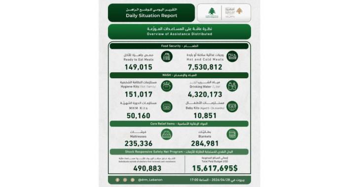 أعلنت “وحدة إدارة مخاطر الكوارث” في السرايا الكبيرة في تقريرها اليومي، أن “العدد الإجمالي للنازحين في مراكز الإيواء بلغ 116154 والعدد الإجمالي للعائلات النازحة في مراكز الإيواء 30526، في حين ارتفعت حصيلة الشهداء إلى 2521 والجرحى إلى 7804”.