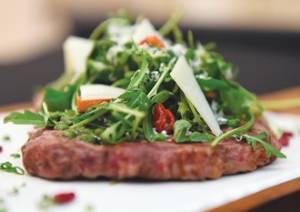 المقادير٢٥٠ غراما من لحم الريب آيأوراق الجرجيرزعترأكليل الجبلحبة بطاطا صغيرةطماطم منزوعة القشر ومشويةمبشور جبن بارميزانصلصة البلسمكملح وفلفلطريقة التحضير ٭ ن