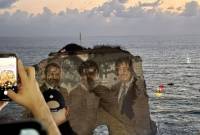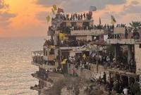 توجه عدد من المشاركين الى أحد المقاهي المطلة على صخرة الروشة خلال اقامة فعالية إحياء ذكرى اغتيال الأمينين العامين السابقين لحزب الله...