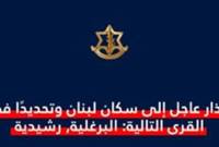 إنذار إسرائيلي عاجل بالإخلاء إلى سكان قريتي البرغلية والرشيدية في جنوب لبنان
