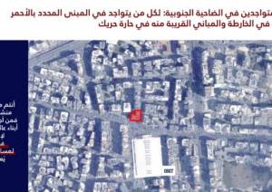 وجه الجيش الاسراىيلي تهديدا إلى جميع السكان المتواجدين في منطقة الضاحية الجنوبية وتحديدًا في المبنى المحدد في الخريطة المرفقة...