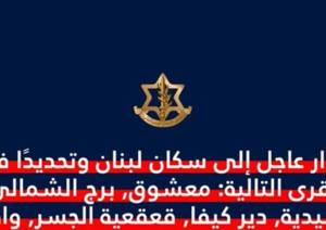 وجه المتحدث باسم الجيش الاسرائيلي افيخاي ادرعي انذاراً عاجلاً إلى سكان لبنان وتحديدًا في قرى معشوق، برج الشمالي، الرشيدية ، دير كيفا ، قعقعية الجسر ، وادي جيلو، البص.