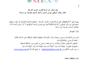 أعلنت شركة طيران الشرق الأوسط في بيان، إلغاء رحلتيها لمجدولتين من وإلى أبوظبي ME416/417 المقررتين ليومي السبت الواقع فيه 7 آذار ويوم الأحد 8 آذار 2026، لأسباب خارجة عن ارادتنا.